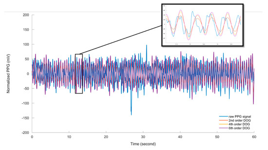 Three orders of the DOG wavelet, namely, = 2, 4 and 6, were tested to investigate the most suitable one for computing the HR from the acquired PPG signals. The processing and analysis of the signals is done using custom script written in MATLAB (The Math Works, Inc., Natick, Massachusetts, USA) based on the Signal Processing and Wavelet Analyser toolboxes.