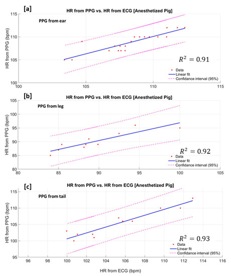 Estimated heart rate from PPG signal vs. heart rate from the gold standard (ECG) measured from the anaesthetised pig′s ear (a), the leg (b) and the tail(c).