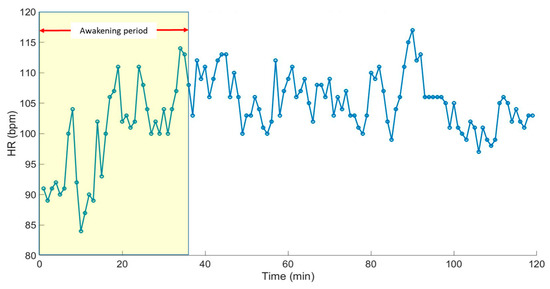 The estimated HR of the non-anaesthetised (moving) pig using the developed CWTFT-based algorithm along the whole measurement period, including the awakening period.