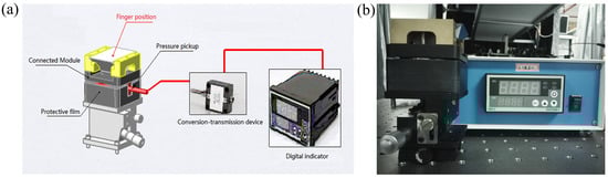 In order to control the pressure of the human in contact with the prism surface, a digital pressure sensor has been designed and installed under the prism, to ensure that no deformation occurs under the action of the pressure. The sensor array displays the value of pressure in real time, without changing the position of the prism. Figure 2a shows the schematic diagram of the digital pressure sensor array device, whereas Figure 2b shows the corresponding setup. The sensor is composed of five parts: connection block, pressure sensor, protective film, transmission device, and digital display.