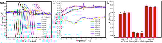 Terahertz (THz)-attenuated total reflection (ATR) spectra with the thumb placed at different regions on the prism: (a) the time domain spectra, (b) the reflection spectra, (c) error tree diagram of the reflectance at 0.3 THz.