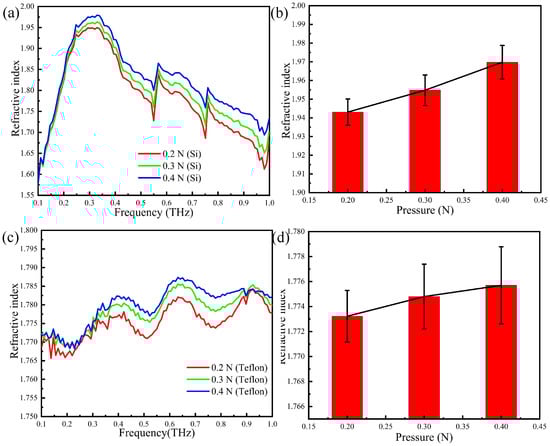 The refractive index of the thumb skin is calculated by the reflection spectrum and shown in Figure 8a,c. By comparing Figure 8b,d, one sees that two refractive indices are different in value. This may be explained that the depth of the THz wave permeating the skin of the thumb is different, and the refractive index of the actual human skin is not uniform with the increasing of the skin depth. In other words, although the THz wave may penetrate deeper into the skin when the Teflon prism is present, the uneven refractive index of the skin causes interference and the overall effect is detrimental.
