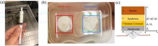 In order to properly compare skin properties, two different types of handcream are selected. Their ingredients and functions are listed in Table 1. In the experiment, handcream with 2 mL volume was extracted into the needle tube, as shown in Figure 9a. In combination with the lists of ingredients, handcream 1 is transparent and moisturising, in turn, handcream 2 has thick texture and locks a strong moisture, as shown in Figure 9b. When handcream works with the human skin via silicon prism, it can be approximated as the stratified media model including three main parts: stratum corneum (SC), epidermis, dermis [25,47,48], as shown in Figure 9c.