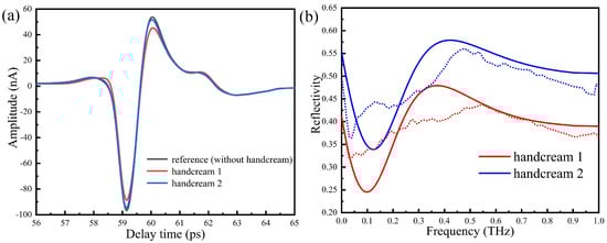 By numerical calculation, we show in Figure 10b how the reflectivity of handcream changes with the frequency. The reflectivity of handcream 1 is smaller than handcream 2, which is in good agreement with the experimental results. The two curves experience ups and downs and tend to be saturated around 0.55 THz. In this way, it is possible to quantitatively evaluate the properties of handcream.
