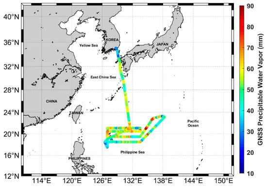The PWV estimated from the shipborne GNSS observations with the vessel ISABU trajectory. The original purpose of this cruise campaign was to observe warm pool air–sea heat interaction supported to develop Typhoons. While a typhoon approaches the observation area, the vessel stayed in a safe zone of the neighboring countries.