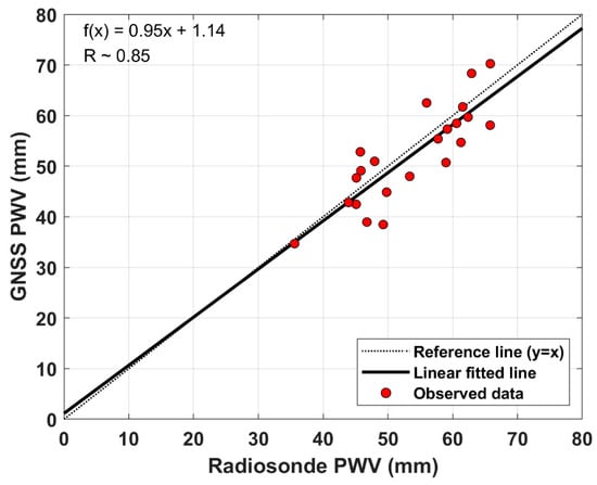 Figure 4 shows the results of comparing the GNSS derived-PWV and radiosonde retrieved-PWV during the period from DOY 242 to DOY 264, 2018. Some radiosonde observations launched from the vessel ISABU can be inaccurate due to the loss of signals from the radiosonde. It can have a significant impact on comparing PWVs from the two different observations. In this study, we have excluded radiosonde data with some signal losses. As shown in Figure 4, a linear regression model was considered to investigate the correlation between GNSS-PWV and radiosonde-PWV. The resulting line from the linear regression analysis was plotted on a scatter diagram. The absolute magnitude of the correlation coefficient (R) between the two variables was 0.85. According to a classification proposed by Schober et al. [35], this indicates that there is a high correlation (0.70–0.89) between the two variables in the Pacific Ocean.
