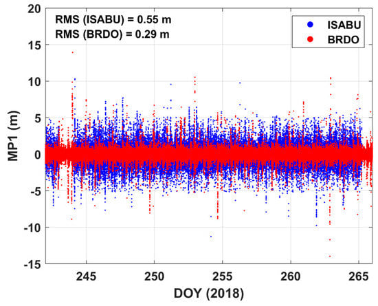 Time series of GPS L1 code multipath (MP1) errors. The blue dots and red dots represent MP1 at the vessel ISABU and MP1 at the ground BRDO station, respectively.