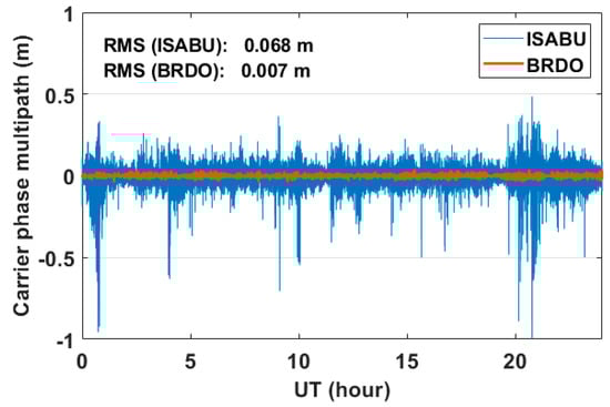 Figure 6 shows the time series of GPS L3 carrier phase multipath errors on DOY 242, 2018. The carrier phase multipath errors on the sea surface and the ground are marked with a solid blue line and a solid brown line, respectively. As shown in Figure 6, the carrier phase multipath errors are very tiny compared to code MP1 errors. Similar to the code MP1 errors, it can be seen that the L3 carrier phase multipath error on the sea surface is much larger than that of the ground. In the BRDO station, the carrier phase multipath errors have a value ranging from −0.05 to 0.05 m. The RMS value of them is approximately 0.007 m. On the other hand, most of the errors in carrier phase multipath at the vessel ISABU changed from about −0.2 to 0.2 m. In addition, the carrier phase multipath errors reached up to about 1 m. The RMS value of them is approximately 0.068 m. The RMS values of carrier phase multipath errors between on the sea surface and the ground are about ten times different. As a result, the large carrier phase multipath errors at the vessel ISABU may have been a predominant error factor in calculating GNSS-PWV.