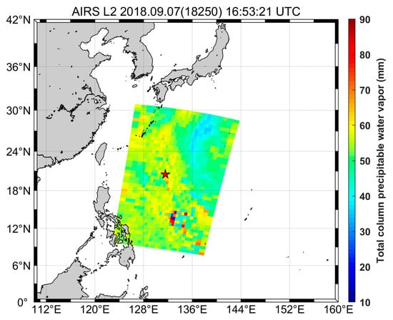 The AIRS aboard NASA’s Earth-observing system satellite, Aqua, is capable of measuring the water vapor over the oceans [31]. In this study, we use standard level 2 products (i.e., AIRS2RET). They can be downloaded from the website (https://www.image.ucar.edu/DAReS/DART/Manhattan/observations/obs_converters/AIRS/AIRS.html). The AIRS level 2 retrievals contain geophysical quantities, such as estimates of atmosphere and surface properties, profiles of temperature, water vapor, and ozone, total precipitable water vapor (PWV), etc. In geophysical quantities, the AIRS satellite’s PWV is the total column water vapor (unit: mm) from the surface to the upper troposphere. The uncertainty of the AIRS-PWV is within 5% in the intermediate range between 20 and 40 mm. On the other hand, it has a wet bias of more than 5% for low PWV values and a dry bias of more than 5% for high PWV values [32]. A 6-min AIRS granule does not exactly match the ship’s locations. Therefore, the averaged value of the PWV data is calculated within the latitude ± 0.5° and longitude ± 0.5 ° based on the location of the shipborne GNSS receiver from the AIRS dataset.