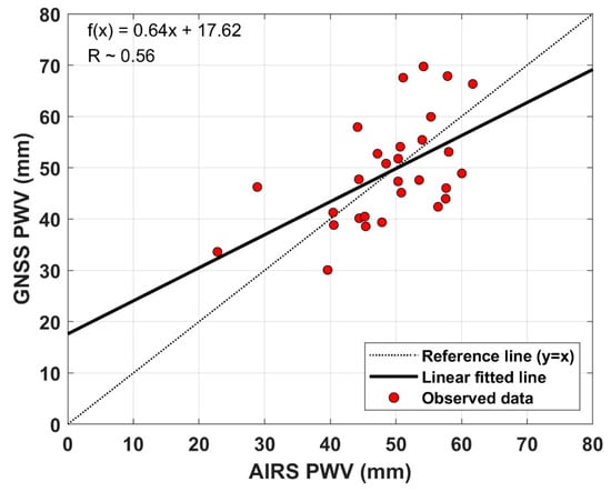Usually, radiosonde measure takes approximately 30 min to travel up through the significant paths with a broad distribution of water vapor in the troposphere [33]. In this study, GNSS-derived PWV was used as the averaged value for 30 min, starting with radiosonde observation. AIRS2RET dataset has a time resolution of 6 min [31]. For comparison of GNSS-PWV and AIRS retrieved-PWV, GNSS-PWV was adjusted to an averaged value for 6 min.