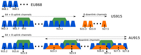 LoRa uses Industrial, Scientific, and Medical (ISM) frequencies, and every country or region has its frequency band. Europe uses 868 MHz, while the USA, Brazil, and Australia use 915 MHz, for example. Each country also uses a sub-band frequency scheme to create channels of transmissions. Each sub-band is composed of a number of frequencies called channels. Australia, for example, uses sub-bands composed of eight channels (frequencies) using 125 kHz bandwidth. The sub-band is essential to separate networks in the same area by using different frequencies. Figure 1 presents the channel scheme for Europe (EU868), United States (US915), and Australia (AU915) [46]. The European regulation specifies that the network channels can be freely attributed. However, all end-devices shall implement the three default channels (868.1 MHz, 868.3 MHz, and 868.5 MHz). The United States and Australia have a similar channel scheme with 64 uplink channels utilizing 125 kHz bandwidth, and incrementing linearly by 200 kHz. Both regions also implement eight channels with 500 kHz bandwidth and increment linearly by 1.6 MHz. The difference between US915 and AU915 is the downlink channel. Both have eight channels utilizing 500 kHz bandwidth, but US915 uses a separated band from the uplink scheme, while in AU915 the downlink overlaps the uplink frequencies. Countries and regions may also determine the amount of time one single device could use the channel by implementing duty cycle restrictions. In Europe, the duty cycle is 1% [47].