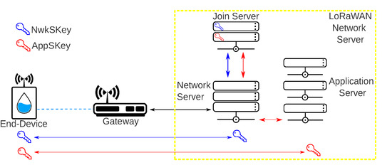 Every end-device has a unique identifier called DevEUI, an application identifier called AppEUI, and a application key called AppKey. The AppKey is used to generate the Network Session Key (NwkSKey) and the Application Session Key (AppSkey). The NwkSKey is used to provide integrity to the data and MAC commands. The AppSKey provides end-to-end cryptography. The LoRaWAN implements two different network join methods handled by the Join Server to authenticate an end-device [51].