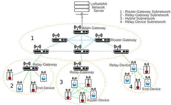 A hybrid topology is also a possible implementation, with part of the network using routers and another part using relays. Both routing or relay level could be implemented in the end-devices layer or gateway layer. Several end-devices could transmit data packets to a Relay-Device, and the Relay-Device would forward all data to a Router-Gateway. Finally, the Router-Gateway would send all the packets until they reach the main gateway. Another option is a subnetwork formed by Router-Devices connected to one Relay-Gateway that will forward the messages to the main gateway. The work presented in [27] uses the idea of a hybrid topology with Router-Devices connected to one Relay-Gateway. The authors connected several Router-Devices to monitor underground streets for a smart city proposal. All the Router-Devices data are forwarded to one root node. The authors called the root node as a relay. However, by the description, we classified the device as a Relay-Gateway because it is a multichannel radio and splits the networks.