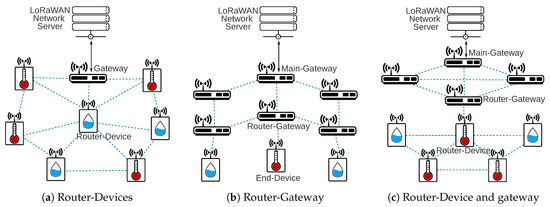 The router topology describes the network architectures based on devices with routing capabilities. The routing protocols can work at the end-devices or at gateway level. Figure 7a,b depicts both solutions individually and Figure 7c puts in the same network infrastructure the two routing levels.