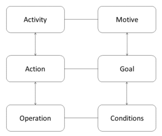 The first principle is the three-level hierarchical structure of activity that serves as the backbone of AT, framing consciousness at different levels. The levels are activity, action, and operation, which are related to motive, goal, and condition, respectively (see Figure 1) [76,85].