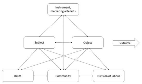 The activity system model (ASM)—Engeström’s triangle (modified from [117] (p. 63)).
