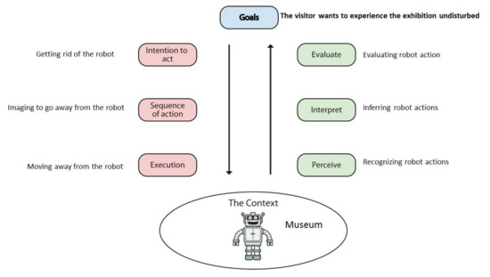 The path going from the current situation in the context to the goal stage is termed gulf of evaluation, representing the comprehension gap between the actual state of the robot in its context and the goals and overall motive of a person. This gulf is handled by the human by making sense of what can be obtained from the robot in relation to the desired state/situation in the context [91]. This means that the gulf of evaluation refers to the difficulty of assessing the current state/situation in the context and to what extent the robot supports the detection and interpretation of that state in the particular context [124]. Imagine a humanoid robot at a museum (context) with the purpose of guiding visitors through an exhibition. A visitor enters the room where the robot is located. The robot turns its face and body towards the visitor, which is observed by the human (perceive—recognize action). The visitor believes that this action means that the robot’s intention is to approach him/her expecting to communicate in some way (interpret—infer intention). The visitor is not in the mood for interacting with the robot, instead he/she wants to stroll around in the exhibition without being disturbed (evaluate).