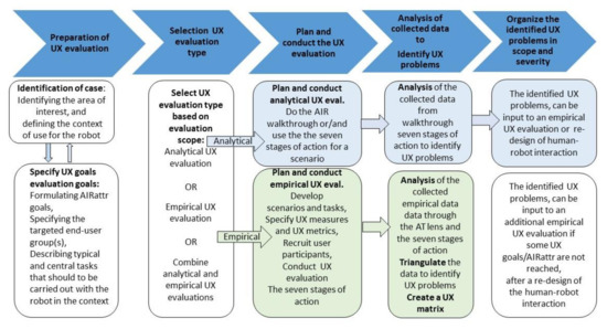 - Validity: The evaluation method should provide support to the end-users by correctly identifying potential issues while interacting with a robot. The method should maximize the identification of relevant usability and UX problems, and at the same time, it should minimize identification of trivial or non-relevant UX problems. As pointed out by Blandford and Greene [94], this aspect is particularly important for evaluation methods, and therefore, we pay additional attention to this criterion.