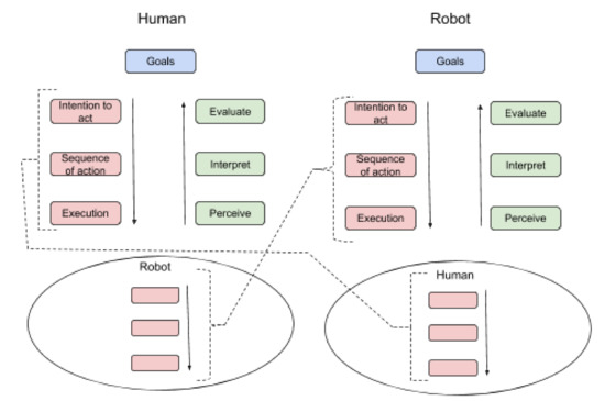The seven stages of action model has been proposed for the HRI field by others, e.g., Scholtz [127] and Taha et al. [128], although not as basis for UX evaluation of action and intention recognition. Based on AT’s influence on Norman’s work [123,124,125], we interpret the seven stages of action model as being more aligned with an AT approach than a classical information-processing approach of human-computer interaction [76,77]. Arguments for our AT inspired view of Norman’s model is the focus of actions, being aligned to the basic principles of hierarchical structuring of activity, tool mediation, object-orientedness, and externalization/internalization (see Section 3.1.1 and Section 3.1.2).
