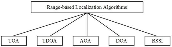Range-based localization algorithms: time of arrival (TOA), time difference of arrival (TDOA), angle of arrival (AOA), direction of arrival (DOA), and received signal strength indicator (RSSI).