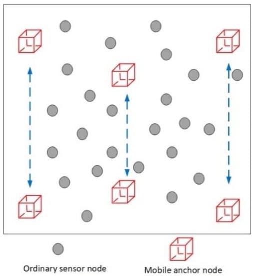 However, if all anchor nodes around ordinary sensor nodes in the local area are collinear, then is a singular matrix. The sensor node location estimation solution obtained through Equation (19) is unique. Moreover, in Phase I, the ordinary sensor node is located and can be used as a new reference node for Phase II. However, it will lead to the accumulation of localization errors, which are not conducive to the localization accuracy of sensor nodes in Phase II. Therefore, in this paper, most sensor nodes are located in Phase I. However, this requires that the sensor nodes can obtain sufficient localization messages in Phase I. To cut costs, mobile anchor nodes do not account for a high proportion in UWSNs. Therefore, to weaken the collinear problem of anchor nodes, improve the localization ratio of ordinary sensor nodes in Phase I, cut costs, and expand the valid area covered by anchor nodes. Mobile anchor nodes need to be deployed effectively.