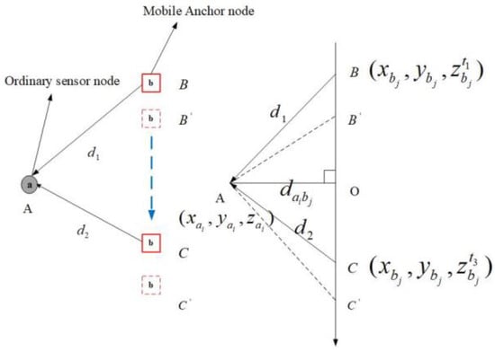 To obtain more accurate positioning of the sensor node, most underwater localization schemes estimate the location of sensor nodes by using anchor nodes, detachable elevator transceivers (DET) [], and unmanned underwater vehicle (UUV) [] assistance. In addition, a UUV can be a remotely operated vehicle (ROV) or autonomous underwater vehicle (AUV). Compared with other auxiliary equipment, the cost of mobile anchor nodes is relatively low. In a three-dimensional (3D) UWSN, four non-coplanar anchor nodes are required to estimate the location of sensor nodes. In a two-dimensional (2D) UWSN, the sensor node can be located by using only three non-collinear anchor nodes. In this study, we assumed that all sensor nodes are equipped with underwater pressure sensors (UPS) to obtain the depth information in real time. Then, the projection algorithm was used to convert the 3D sensor node localization to 2D planar positioning. Moreover, in a realistic underwater environment, the flow of water causes the sensor node’s (including anchor nodes) overall migration. Therefore, the motion of sensor nodes is considered and analyzed in this paper.