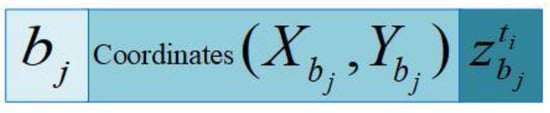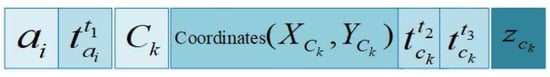 As shown in Figure 3, we assume that the underwater acoustic velocity is constant, . At timestamp, the anchor node propagates the localization message block at location B. At the timestamp, the ordinary sensor node receives the localization message, and the anchor node is in position . Moreover, is the first communication distance. At the timestamp, the anchor node sends the message block and is in position . At the timestamp, the ordinary sensor node receives the message block, and the anchor node is at position . Moreover, is the second communication distance. We assume that all sensor nodes are equipped with UPS. Therefore, all sensor nodes (including anchor nodes) can obtain their coordinate information in real time. Here, and can be projected on the horizontal plane of the ordinary sensor node, and the projection distance is . Furthermore, the localization message block is shown in Figure 4. Here, is the ordinary sensor node, is the mobile anchor node, and are the plane coordinates of the mobile anchor node.