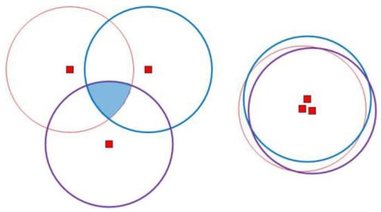 Since the sensor node is configured with UPS, the sensor node can locate itself by receiving messages from three different non-collinear anchor nodes. As shown in Figure 7, the shaded part is the intersection region of three non-collinear anchor nodes, and the sensor nodes in this region can locate themselves. This shaded area can be referred to as a valid area. In general, however, the valid area of this arrangement is small. When three non-collinear anchor nodes are close to each other, the valid area can be approximated to the communication area of a single anchor node. However, if the distance between anchor nodes is too close, its function is equivalent to that of a single anchor node, which is not conducive to the localization of sensor nodes.