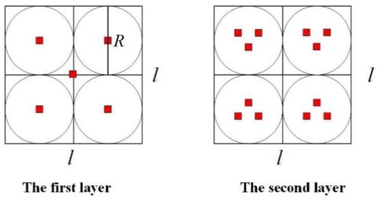 To facilitate the elaboration of ideas, the anchor node deployment is divided into two layers, as shown in Figure 8. In the first layer, to enable most sensor nodes in the monitoring area to receive messages from anchor nodes at least once, anchor nodes are deployed at the center of each uniform grid and the intersections of the grids. Moreover, the number of anchor nodes is . According to the analysis in Figure 7, to make most sensor nodes receive enough localization information from anchor nodes and weaken the collinear problem of anchor nodes, in the second layer, three anchor nodes are placed in each region grid, to form an equilateral triangle.