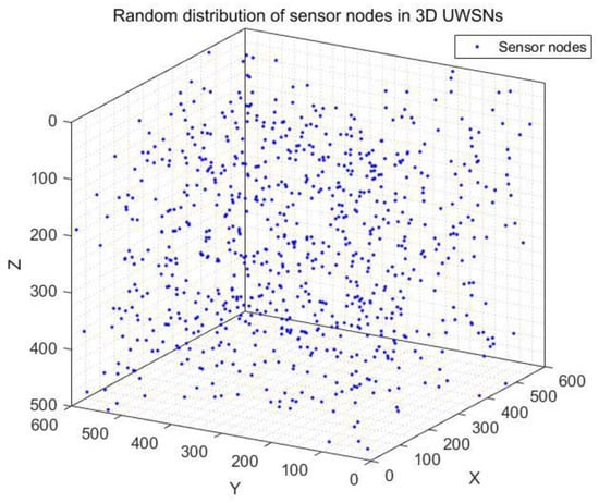 Random distribution of sensor nodes in 3D UWSNs.