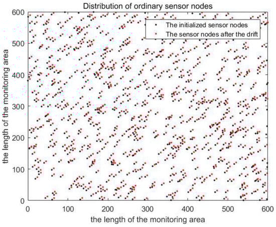 Distribution of ordinary sensor nodes before and after drifting on the projection plane.