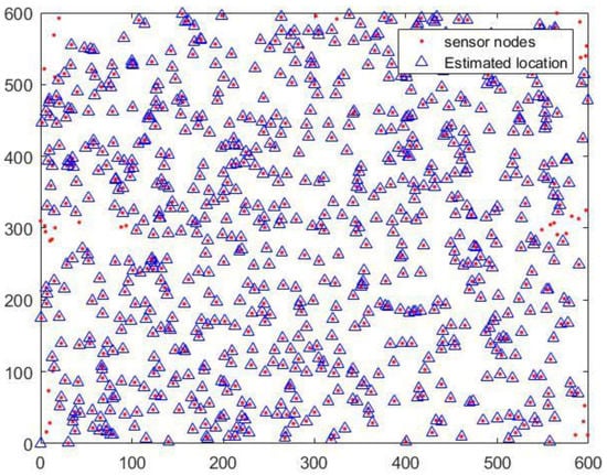 When the transmission range of anchor nodes is 200 m and the time interval is the 30 s, the localization effect of sensor nodes in the proposed localization scheme is shown in Figure 14. The figure shows the real and estimated locations of the ordinary sensor nodes, respectively. It can be seen intuitively from Figure 14 that most of the ordinary sensor nodes are located. Some ordinary sensor nodes at the edge of the monitoring area are not located. This can be caused by not receiving enough localization messages, which is inevitable. Therefore, in future work, we will consider the reasonable positioning of the marginalized ordinary sensor nodes.