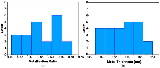 Evaluation of process variation across a single wafer bearing 24 resonators: (a) distribution of the metallization ratio measurements using an optical microscope, (b) distribution of metal thickness measurements using a stylus profilometer.