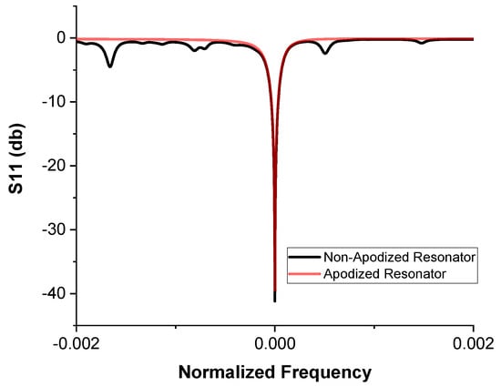 The effect of apodization. S11 responses for apodized and non-apodized resonators.