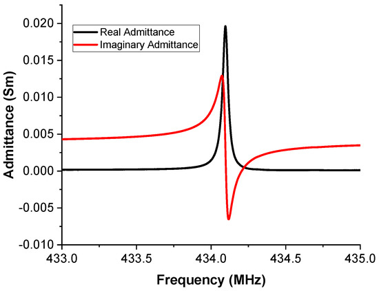 The real and imaginary admittance plots can be found in Figure 5. The resonant frequency for each resonator was extracted from the imaginary admittance plot. The imaginary admittance will be zero at the resonant and anti-resonant frequencies. The bandwidth was extracted from the real admittance plot and corresponds to the FWHM of the peak. The Q-factor here is defined as the resonant frequency divided by the calculated bandwidth. By converting the admittance (Y) to impedance (Z) using the equation: