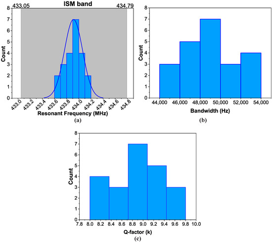 A wafer with 24 resonators uniformly distributed on it was fabricated. Figure 6a–c shows the variations of the resonant frequency (MHz), the bandwidth (Hz) and the Q-factor across the devices. After the characterization, 22/24 resonators were fully functional, resulting in a 91.6% yield. The distributions presented are a result of the distributions of the metallization ratio and metal thickness presented in Figure 3a,b, respectively. Most importantly, the combination of those two distributions results in a kHz variation in the resonant frequency, as seen in Figure 6a. A resonator designed for interrogation in the frequency domain must have high quality factor and small bandwidth, so that a reader module can distinguish each resonant frequency without any interference between the responses. In our case, the maximum bandwidth was 54 kHz and most of the devices had a bandwidth around 49 kHz, as seen in Figure 6b. Moreover, the Q-factor was between 8000 and 9800, as demonstrated in Figure 6c. These values are sufficient for a standard reader module to be able to effectively interrogate the resonators wirelessly [16].