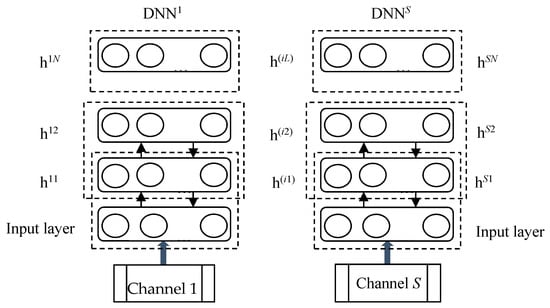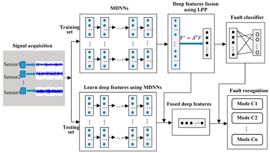 As shown in Figure 1, with the purpose of obtaining more complete and reliable data, S sensors are installed so as to collect multi-channel signals and construct multiple DNNs (MDNNs). In MDNNs, raw timing signals collected from different sensors are inputted into different DNNs. The deep features extracted from MDNNs are usually redundant and high dimensioned. LPP is a dimension-deduction method that can be used to fuse deep features and effectively preserve local structure in lower dimension [,].