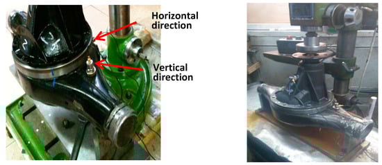 As shown in Figure 3, a set of contrastive experiments are implemented on the test rig of automobile final drive. The test rig contains a control cabinet section, a drive section to activate the driving motor and a fixture section. The rotating speed can be controlled by the cabinet section. The fixture section is to simulate the running situation under a specific rotating speed. To carry out reliable monitoring, two vibration acceleration sensors are located in orthogonal positions so as to collect more stable multi-channel sensory data along a different transmission path. This kind of sensor is frequently used to acquire high-frequency signals in mechanical vibration engineering. The characteristics of vibration acceleration sensors are a wide frequency response, a wide dynamic range, and high reliability. Figure 4 shows the locations of multiple sensors.