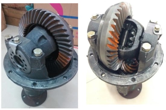 The most common failure modes of final drive include gear crack, gear error, gear tooth broken, gear burr, misalignment and gear hard point []. These faults usually occur in the gears pair as shown in Figure 5 and Figure 6. Signals from the above 6 fault modes and normal mode are collected. To collect more stable and fault-sensitive vibrational signals, based on previous research and experiences, the frequency of sampling is 12,000 Hz and the rotational speed of the motor is 1200 r/min. The frequency of sampling must be higher than the pre-estimated gear meshing frequency or the detailed information of failure will be lost.