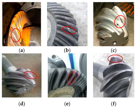 Faulty gears pairs: (a) gear crack, (b) gear error, (c) gear tooth broken, (d) gear burr, (e) misalignment, (f) gear hard point.