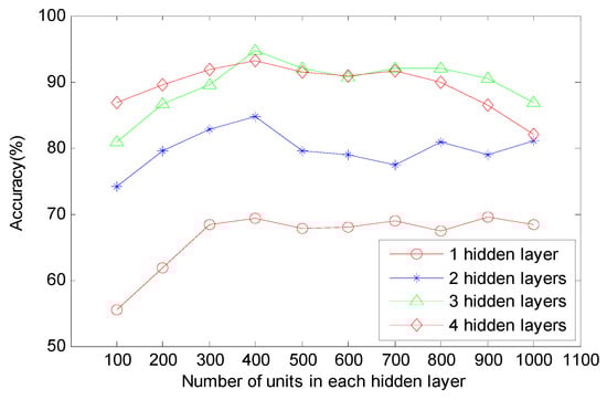 With regard to a diagnostic model based on MDNNs, the layout of deep architecture has an important impact on accuracy. In order to design the optimal model, we investigate the accuracy variation of different deep architectures. As shown in Figure 7, the diagnostic accuracy improves obviously as the deep architectures changes from containing only one hidden layer to four hidden layers. However, as the hidden layer changes from including 100 neurons to including 1000 neurons with an interval of 100, the diagnostic accuracy is fluctuating up and down. According to the results, the optimal model based on MDNNs consists of three hidden layers and there are 400 units in each hidden layer.