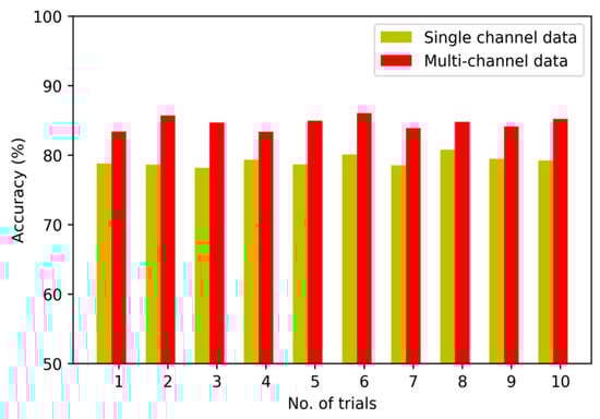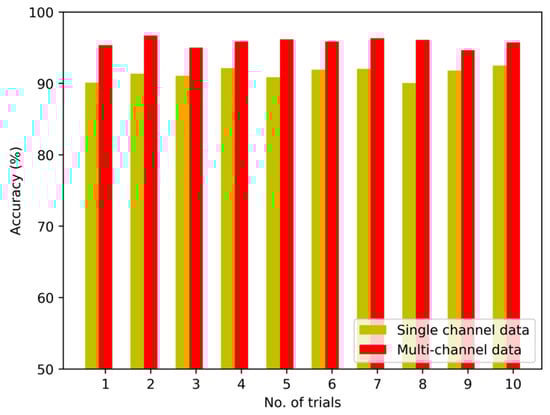To verify the validity of the fusion strategy on multi-channel sensory data, we implement the first set of experiments to compare several diagnostic models based on multi-channel data and single sensory data, respectively. Figure 8, Figure 9 and Figure 10 show the detailed diagnostic results of these contrastive models based on the proposed method, BPNN and SVM in ten trials.