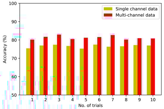Moreover, compared with the training time of models without fusion strategy, which is 58.56 s, the training time of models with the fusion of multi-channel data using the LPP algorithm is obviously decreased to improve the training efficiency. The reason behind the improvement is that the fusion process using LPP can decrease the dimension of high-dimensional features so as to decrease the computational complexity [,].