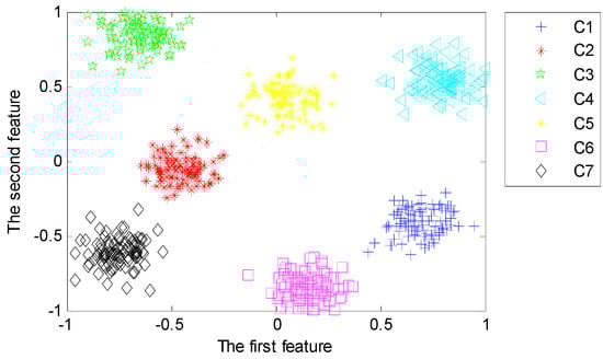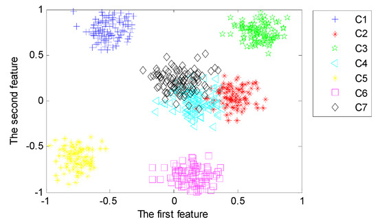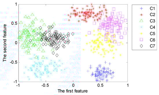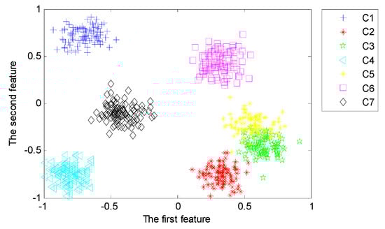 In order to intuitively judge the fault-sensitivity of the learned features, the first two principal components of the fused features are presented for visualization. The typical components fused by PCA of the last hidden layer are shown in Figure 17. Some features of pattern C3 and pattern C5 are mixed and failed to distinguish. By comparing Figure 16 with Figure 17, we can conclude that LPP is more superior in retaining the local structure of input data that is valuable for fault pattern recognition than PCA. LPP achieve fusion and extraction using manifold learning [,].