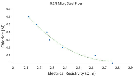 The electrical resistivity of a material, represented by rho (ρ), is a measure of how strongly a material opposes the flow of electrical current. The range of electrical resistivity of concrete depends strongly on the concrete moisture content, with wet concrete behaving as a semiconductor with a resistivity in the range of 104 Ω·cm. Dry concrete behaves as an insulator with a resistivity of 1011 Ω·cm [31]. Therefore, a conductive filler is a necessary ingredient for fabricating this sensor to overcome the high resistivity of concrete [32]. Adding conductive filler reduces the percolation concentration, which is the lowest concentration of filler at which insulating material is converted to conductive material. Several conductive fillers have been investigated including carbon nanotubes, carbon fiber and graphite, however micro steel fibers were chosen for their outstanding properties, including higher abrasion resistance; resistance to micro crack propagation; improvements to the tensile and flexural strength by 120% and 25%, respectively, from adding 0.53% of steel fiber (60-µm diameter and 5-mm length); non-hazardous to work with; relatively cheap (around $0.1 per gram); provides low electrical resistivity; and enhances its sensitivity to the presence of chloride [33,34,35,36]. The micro steel fibers can also be used to evaluate stress, strain and crack propagation or damage of the blocks [37,38,39,40,41]. Functional fillers such as micro steel fiber can reduce the resistivity to 200 Ω·cm and thus aid resistance measurements and improve SNR. One requirement of the device is be able to sense chloride presence in the pore water of the paste. The relationship of chloride ingress to electrical resistivity of cement paste containing 0.1 wt% micro steel fibers is presented in Figure 2.