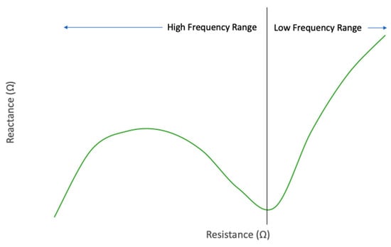 Using these equations, the reactance of the cement block resulted in 216.6 kΩ at 120 Hz and 476.9 kΩ at 1 kHz. This increase in impedance declines with frequencies higher than 10 kHz, as shown in Figure 4. For this reason, 100 kHz was the selected frequency [46]. This frequency balances low impedance and low power, as an increase in waveform frequency can result in higher power consumption and circuit complexity.