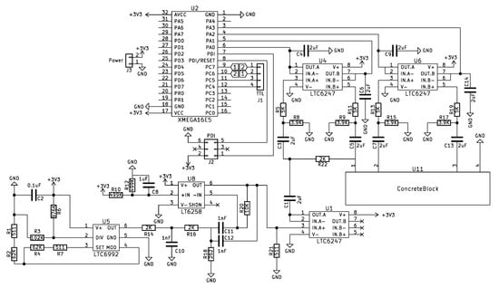 An accurate device that can measure within ±10 Ω of a reference value with minimal deviation over time is presented. This device is low power, low cost and has two form factors: small and extra small footprints. These devices can be embedded into concrete with appropriate ingress protection and successfully measure resistance where calculation for resistivity and chloride ingress can be achieved, as shown in the Section 4. Figure 5 presents the electronic schematic.