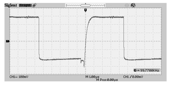 Previous methods of waveform generation incorporated a constant current DC voltage supply injected into a transistor switching at 100 kHz, fed into a capacitor, emulating a square wave generator while consuming low power. The waveform fed across the cement block by the previous device is pictured in Figure 6. This method is simplistic in design and could be implemented with a minimum number of components; however, this method did not provide a clean waveform for feeding into the sensing block over an extended period of time. For the waveform to be effective after prolonged periods, very low DC offset values from the waveform are required, meaning positive and negative cycles of the waveform must be identically mirrored. Such a requirement is very complex to achieve because many electronic components output a DC quiescent offset current, leading to charge retention within the cement block. Thus, the cement block requires a highly purified, zero-offset AC waveform to be fed into it while maintaining low cost, low power and a small footprint, but with large sample volume (relative to footprint). In addition, the design should be able to operate in an array configuration within concrete masses.
