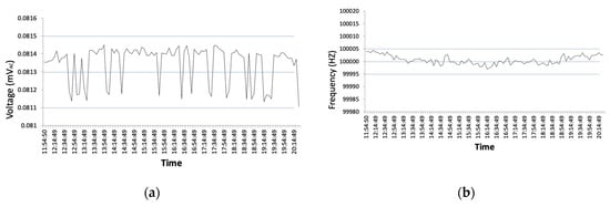 Running the new waveform generator in temperature conditions between 18–25 °C, over 8 h, the frequency deviation was within ±5 Hz tolerance at 100 kHz. Running the waveform generator through a dummy resistor showed a voltage deviation of ±0.2 mVAC after the same extended period of time. Samples were taken for these tests with the HP 34970A data acquisition unit [47], taking over 100 samples in 15-min intervals. Results from these tests are shown in Figure 8a,b.