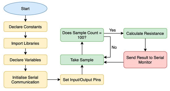 After the program calculates the resistance of the cement block, the results are transmitted to a computer to be displayed to the user, at a sampling rate of 1 s. The flowchart in Figure 9 displays the main modules of the C program uploaded to the ATxmega16E5 microcontroller.